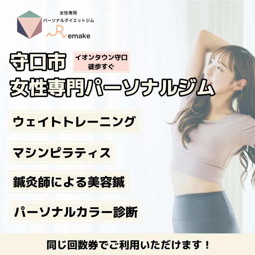 女性専門パーソナルトレーニングジムRemakeは、守口市で地域最安値の安心価格を提供する月額制パーソナルジムです。ピラティスやマシンを取り入れた多彩なトレーニングに加え、無料レンタルやお子様連れ歓迎など、忙しい女性に優しいサービスが充実。経験豊富な女性トレーナーが多数在籍し、ダイエット・姿勢改善・産後ケアまで幅広くサポートします。体験は2,000円、当日入会で無料になる特典もあり、手軽に始められます。